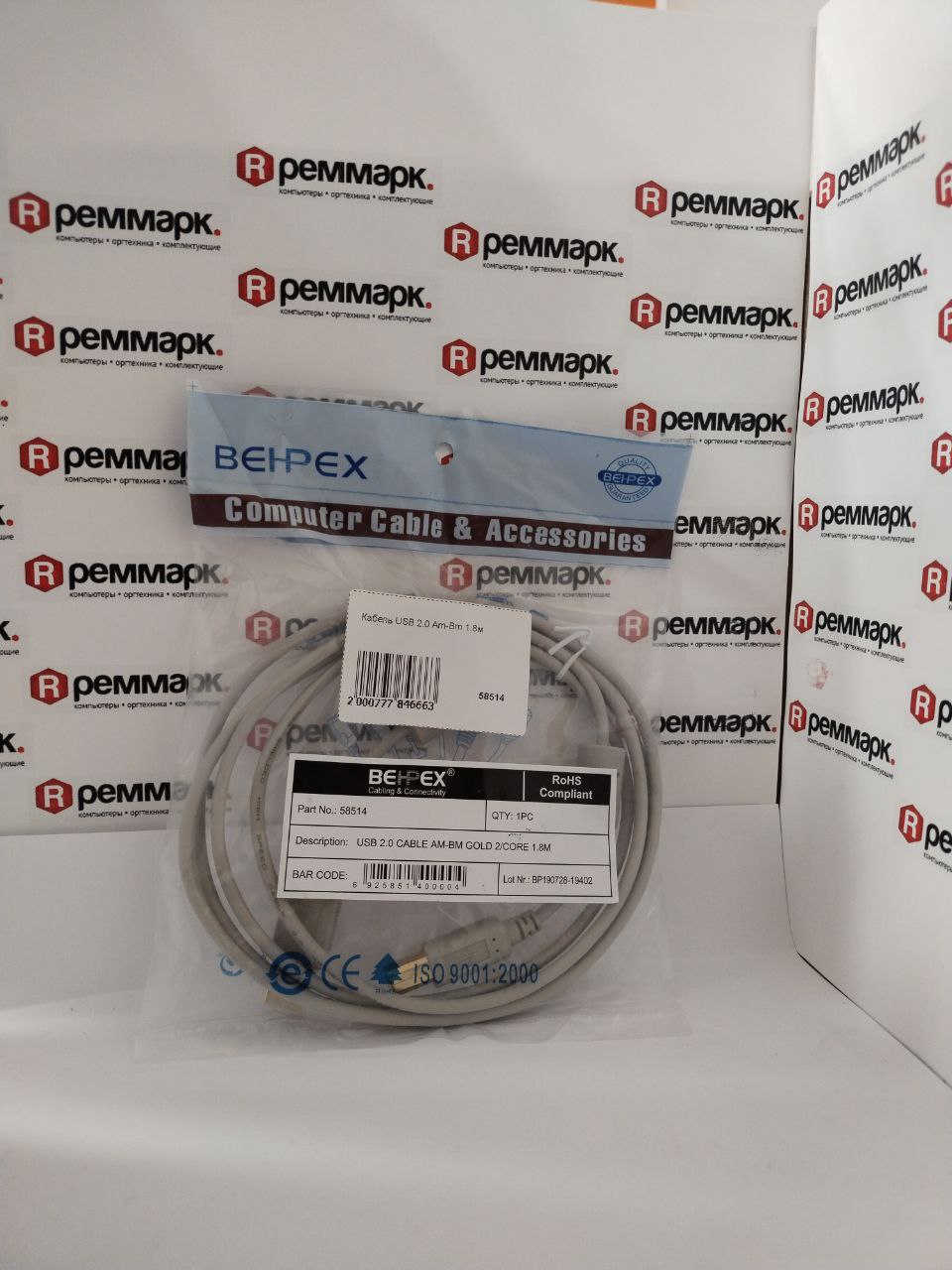 Кабель USB 2.0 Am-Bm 1,8м BEHPEX. Кабель USB 2.0 Am-Bm 1,8м. Предназначен для соединения компьютера с устройствами с устройствами компьютерной периферии (принтером, сканером, МФУ и др.), источникам бесперебойного питания и прочих устройств с портом USB type-B. Кабель принадлежит к категории Hi-Speed (по спецификации USB 2.0), т.е. является "высокоскоростным" и поддерживает передачу цифровых данных в соответствии с протоколом USB 2.0 со скоростью до 480 Мбит/c.